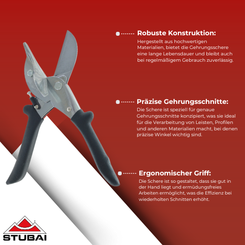 Die Stubai - Gehrungsschere mit einer Länge von 220 mm ist das ideale Werkzeug für präzise Schnitte an Kunststoff-, Holz- und Gummiprofilen. Dank der hochwertigen Verarbeitung und der ergonomischen Griffe ermöglicht sie saubere und genaue Gehrungsschnitte, selbst bei intensiver Nutzung. Diese Schere ist perfekt für professionelle Handwerker, die auf Effizienz und Genauigkeit Wert legen.