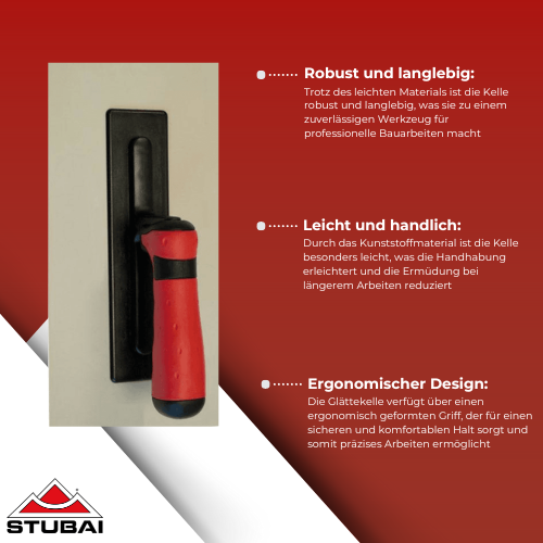 Die Stubai Glättekelle mit Kunststoffstütze, in den Maßen 280x140x3 mm, ist ideal für das Erzeugen glatter Oberflächen. Hergestellt aus robustem Material, bietet sie Langlebigkeit und Stabilität. Die Kunststoffstütze sorgt für zusätzlichen Komfort und einfache Handhabung. Perfekt für professionelle Handwerker und ambitionierte Heimwerker, die Wert auf präzise und hochwertige Arbeitsergebnisse legen.