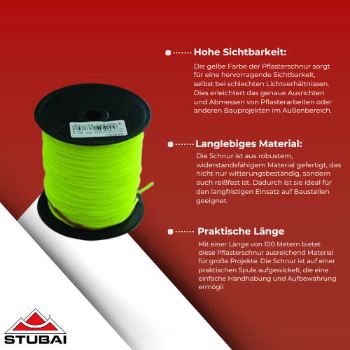 Hohe Sichtbarkeit: Die gelbe Farbe der Pflasterschnur sorgt für eine hervorragende Sichtbarkeit, selbst bei schlechten Lichtverhältnissen. Dies erleichtert das genaue Ausrichten und Abmessen von Pflasterarbeiten oder anderen Bauprojekten im Außenbereich.